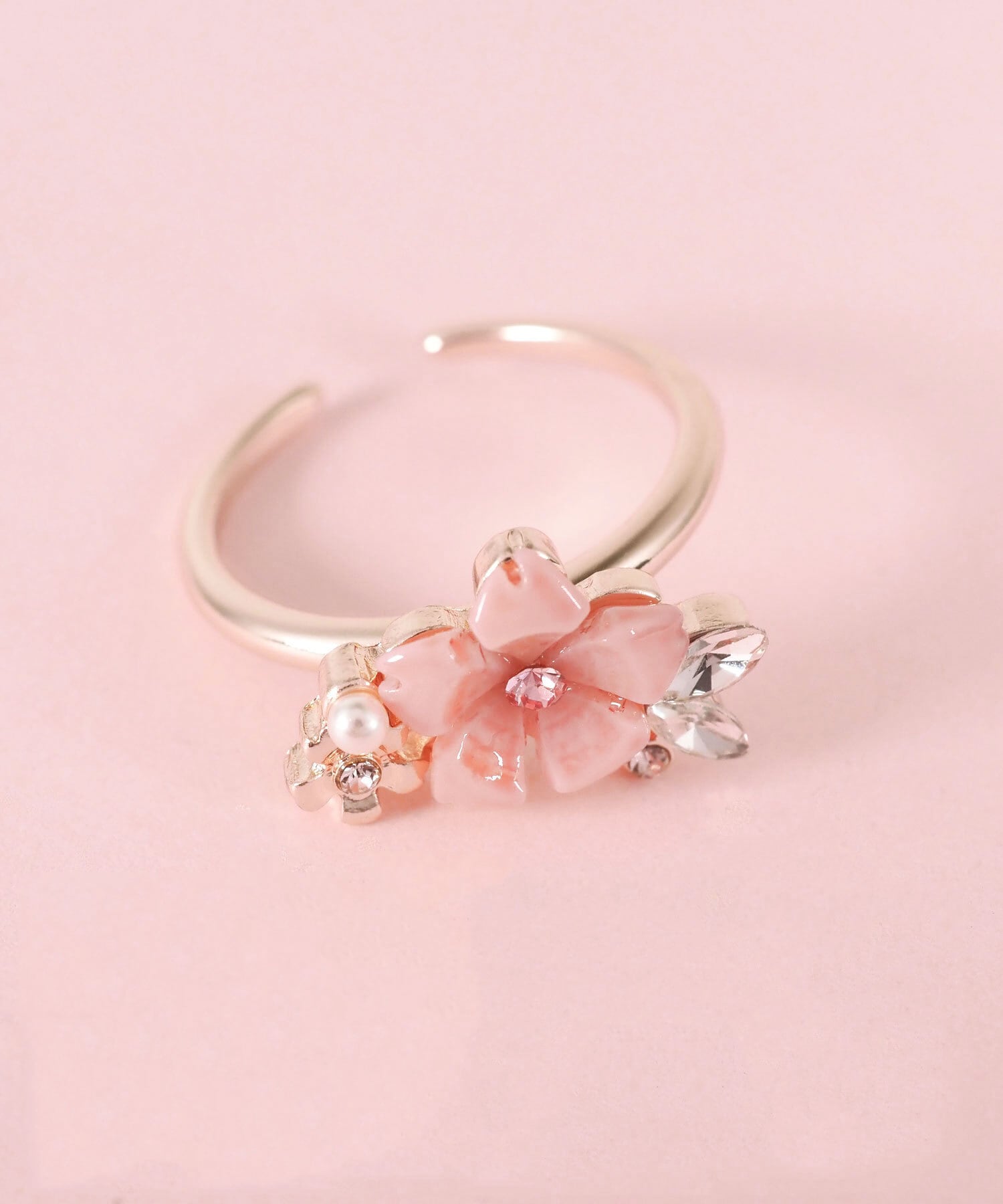 柔らかなピンクの桜(さくら)にパールとドロップビジューを添えたリングです。花びらから煌めくドロップデザインが、手元をパッと明るく見せてくれます。春の訪れと華やかさを添える、特別な日の装いにも日常使いにもぴったりのアイテムです。