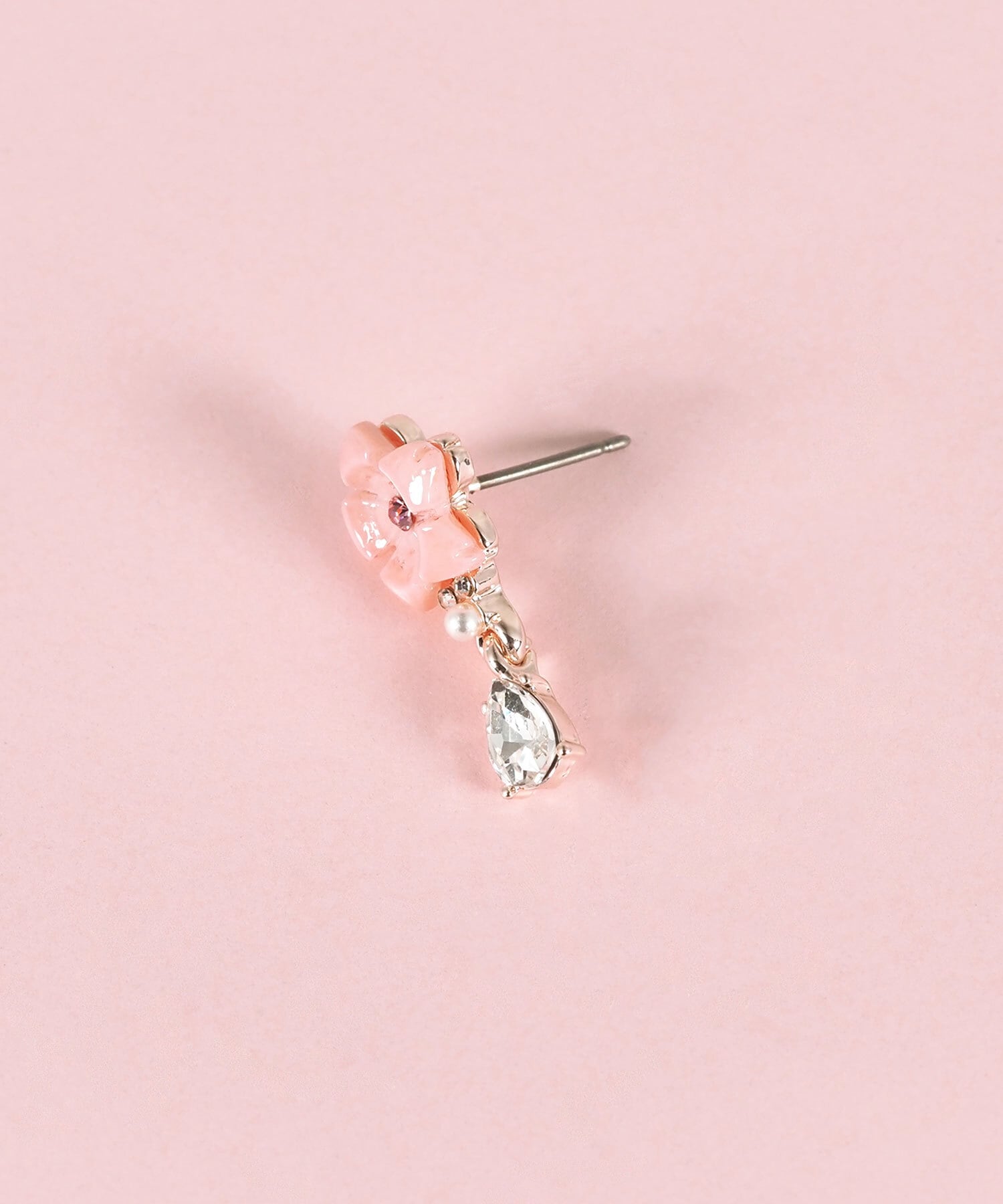 柔らかなピンクの桜(さくら)に、パールとドロップビジューを添えたピアスです。桜(さくら)からしずくが零れ落ちるように垂れ下がったデザインが耳元で揺れるたびに光を集め、お顔周りをパッと明るく見せてくれます。春の訪れと華やかさを添える、特別な日の装いにも日常使いにもぴったりのアイテムです。ペアピアス(両耳用)です。