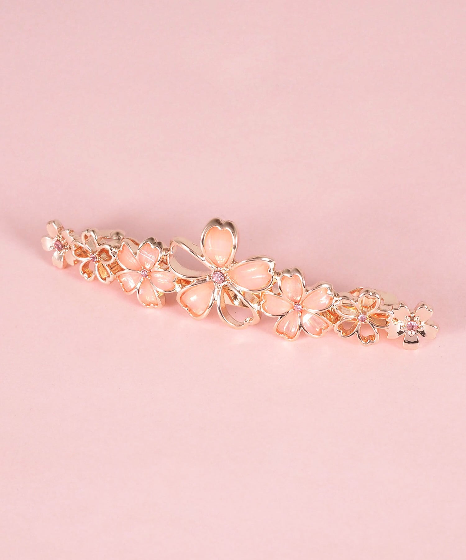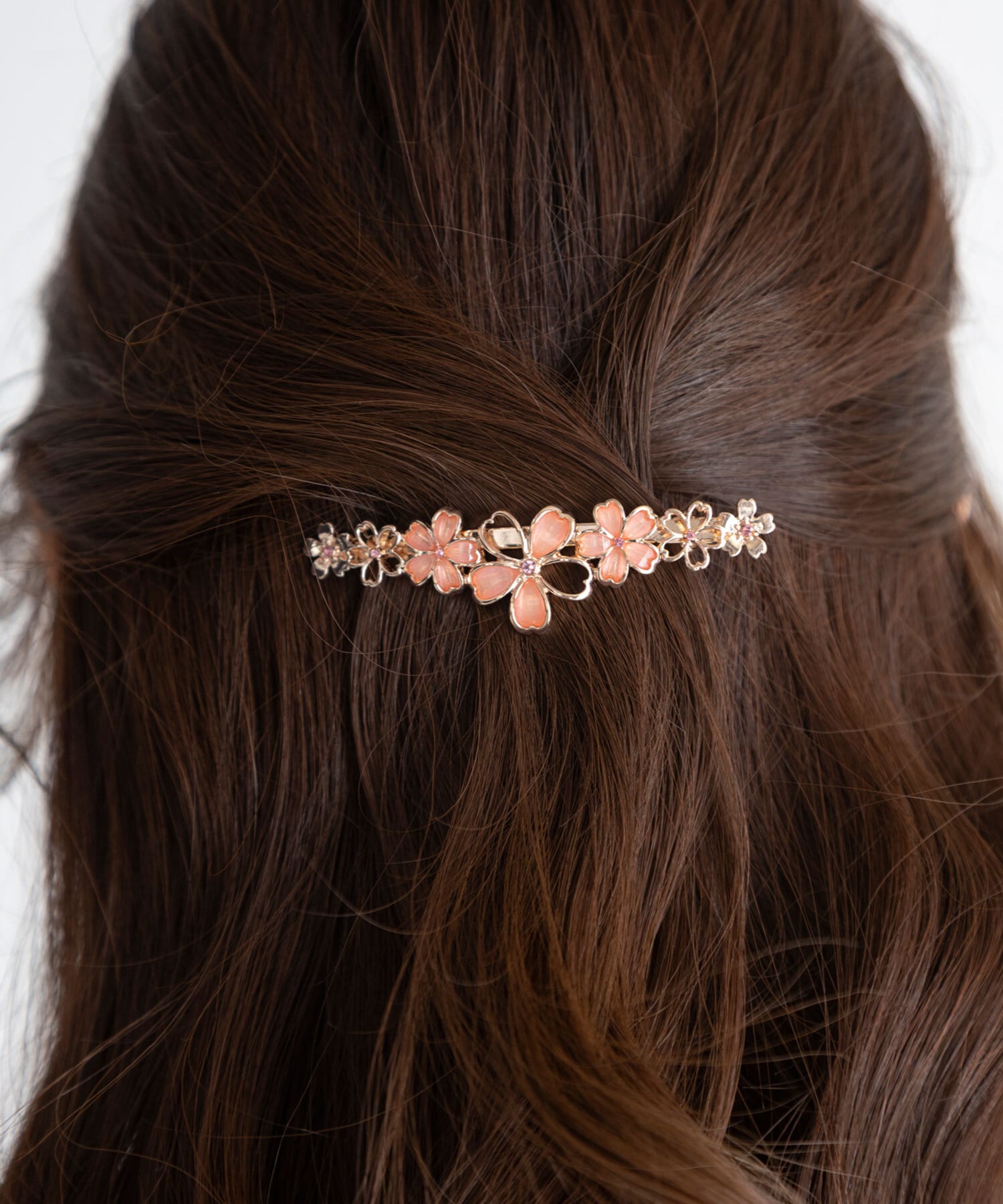 大小の桜(さくら)が可憐に咲きこぼれる、フェミニンなバレッタ。ピンクゴールドの縁取りと優しいサーモンピンクが後ろ姿をふんわりと明るく彩ります。忙しい朝も一瞬で心ときめく春の装いに格上げしてくれます。