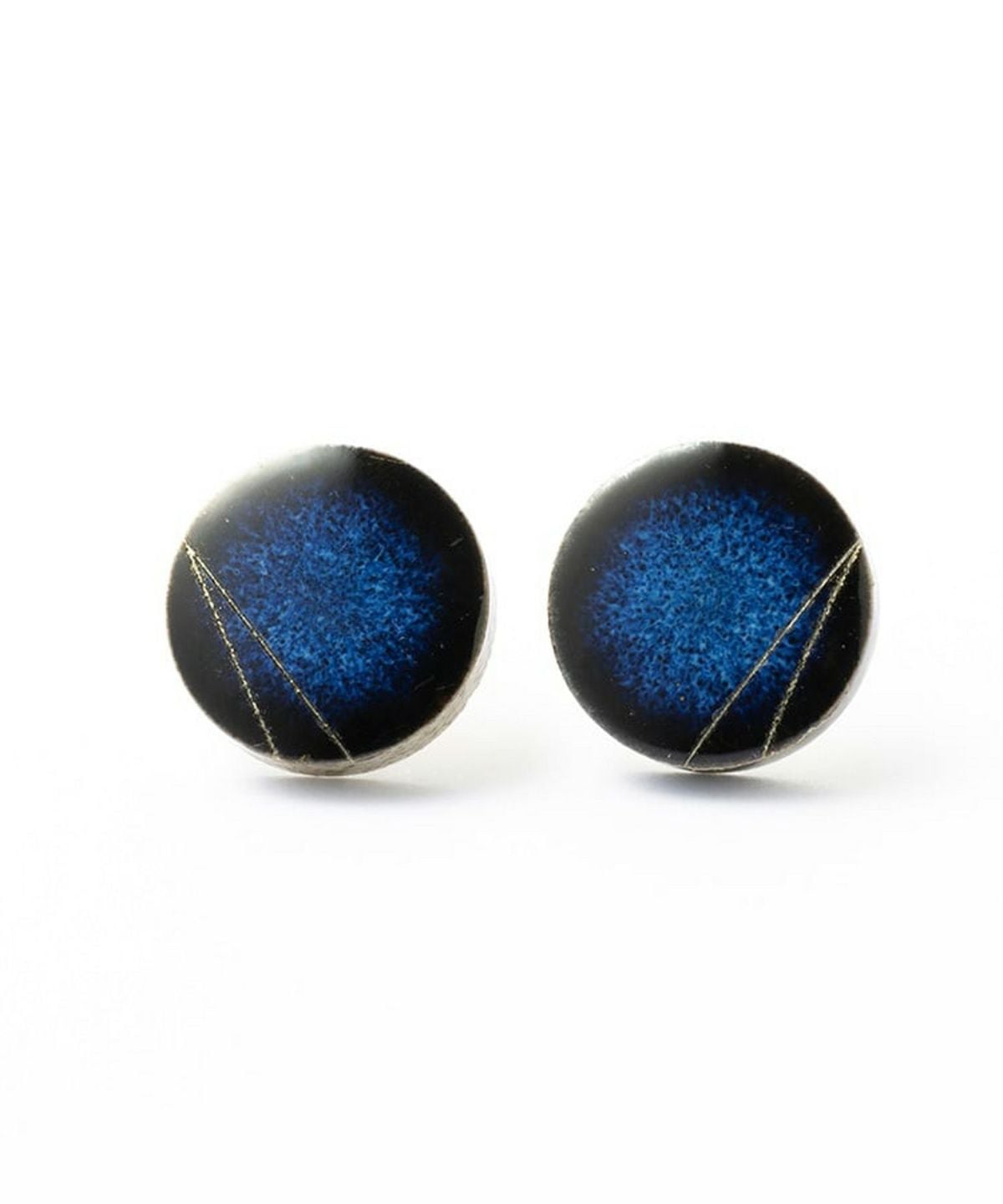 陶器の温かみにラインの幾何学模様がシャープさをプラス。藍色が美しい美濃焼に、シルバーゴールドのデザインを施した上品で知的な雰囲気のイヤリングです。涼しげな美濃焼の色合いは爽やかな印象も。シンプルなデザインながら存在感もあるので、普段使いにはもちろん、パーティーシーンでも活躍してくれます。