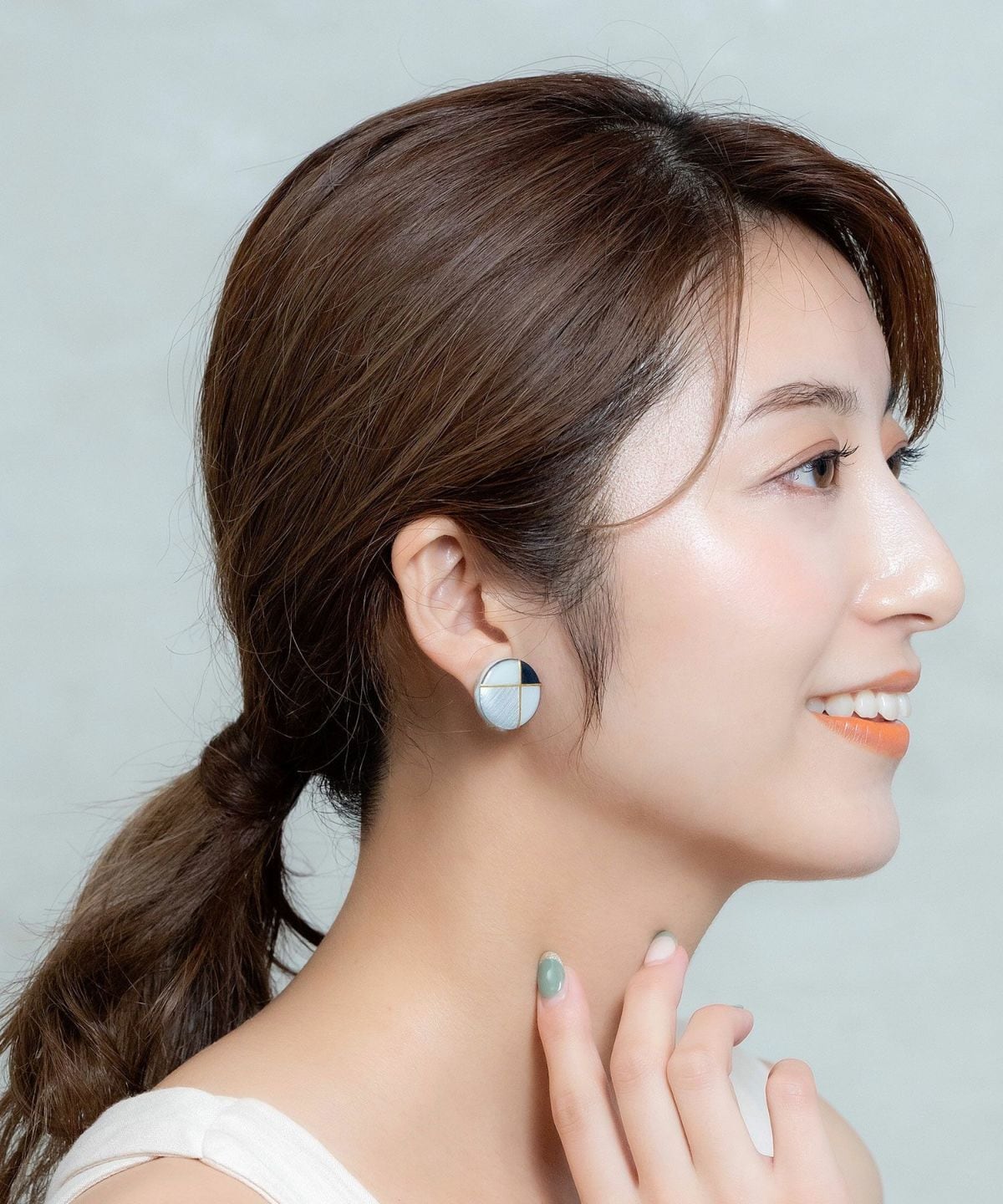 伝統工芸品、美濃焼陶器のピアス。 ダスティホワイトの陶器にフレンチクラシカルのテイストをプラスした、上品なカラーリングが魅力のアイテムです。 温かみのある陶器にメタリックを組み合わせ、存在感を演出。耳元をおしゃれに彩ります。