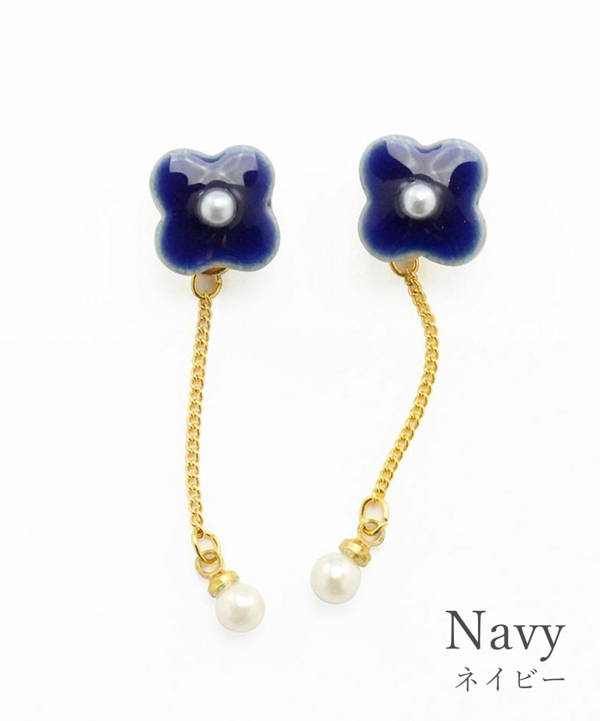 美濃焼陶器のお花にパールを添えたピアス。パールが付いたチェーンがゆらゆら揺れて顔回りを華やかにしてくれます。10mmほどの主張しすぎないサイズ感が使いやすく、ちょっとしたお出かけや、パーティーシーンまで幅広く活躍してくれます。